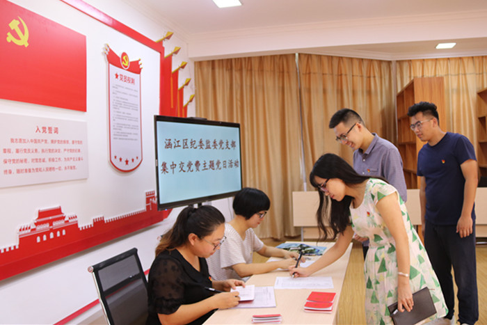 9月14日上午,涵江区纪委监委党支部开展集中交党费主题党日活动,委机关全体党员佩戴党徽、携带党员证参加活动。活动现场,委领导班子成员以普通党员身份参加活动,并以身作则、标杆示范,带头缴纳党费。党费收缴工作做到了手续完备、账目清晰、管理有序。通过此次集中交党费主题党日活动,党支部全体党员体验了一次仪式感十足的党性教育,进一步激发了大家履行党员义务的积极性,增强了党员缴纳党费的主动性,真正让党员缴纳党费成为一种自觉的行为习惯和自我要求。图为9月14日该区纪委监委党支部全体党员现场缴纳党费。(涵江区纪委监委)