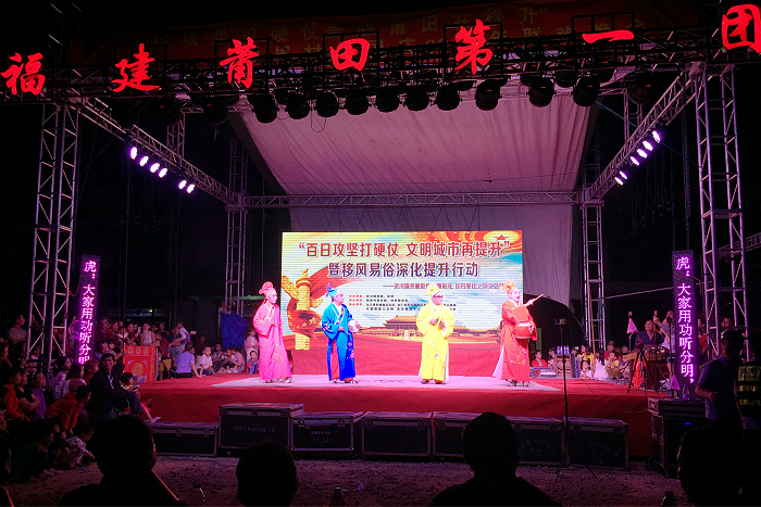 10月5日晚,城厢区灵川镇在径里村文体广场举行“百日攻坚打硬仗 美丽莆田再提升”联欢晚会,为该村群众送上三句半《移风易俗》等精彩节目。图为晚会现场。(