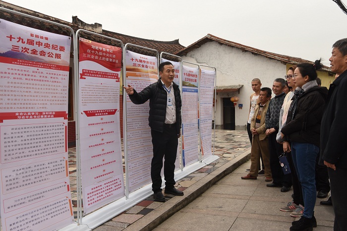 连日来,福建省莆田市荔城区纪委监委组建宣讲小分队,携带报纸、展板等宣传资料深入各村居,用当地方言向广大党员干部群众宣传十九届中央纪委三次全会精神,及时将全会“声音”传递到基层各个“角落”。图为近日,该区纪委监委干部在西天尾镇后黄村利用展板向群众宣讲全会精神。(莆田市荔城区纪委监委)