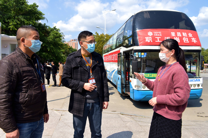 疫情防控期间,福建省莆田市荔城区推出暖心的“点对点”包车回岗举措,该区纪委监委紧盯疫情防控和复产复工重点环节,以精准稳慎监督,督促相关职能部门履行职责,及时解决外来务工人员返岗难的问题。图为2月24日,该区纪检监察干部在辖区内一企业了解复产复工及疫情防控情况。(福建省莆田市荔城区纪委监委)