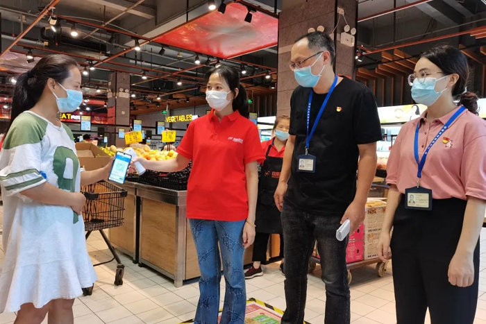 莆田市涵江区纪委监委督导检查小组,采取实地督导和明察暗访,深入机关部门、乡镇(街道)、村居、医疗机构等场所,对落实疫情防控工作要求情况进行全方位监督检查。图为该区应对新型冠状病毒感染肺炎疫情工作督导检查第一小组在涵东街道辖区内一家超市督导检查疫情防控现场。
