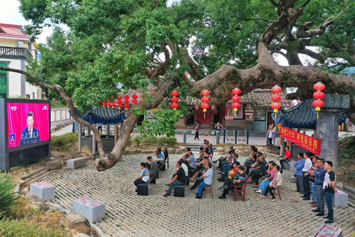 仙游县龙华镇金沙村干部群众在廉洁文化广场收看党的二十大开幕盛况。