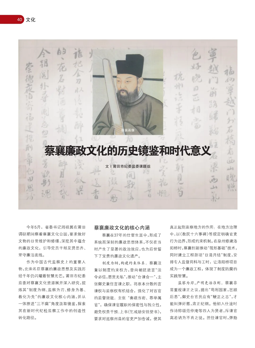 作为中国古代监察史上的重要人物,北宋名臣蔡襄的廉政思想及实践历经千年仍闪耀着智慧光芒。莆田市纪委监委对蔡襄文化资源展开深入研究,提炼其“制度为纲、监察为刃、修身为基、教化为先”的廉政文化核心内涵,并从一体推进“三不腐”角度汲取镜鉴,探索其在新时代纪检监察工作中的创造性转化路径。