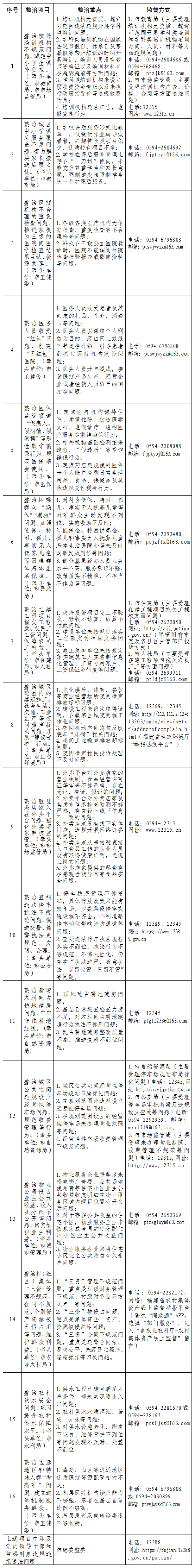为方便群众参与监督和反映问题,现公布2022年度16项“点题整治”项目、整治重点及监督方式: