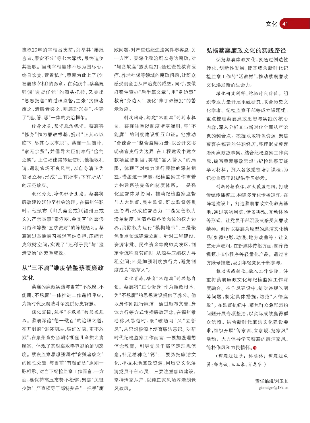 深化研究阐释,挖掘时代价值。组织专业力量开展系统研究,联合历史文化学者、纪检监察干部等成立课题组,重点梳理蔡襄廉政思想与实践的核心内容,深入分析其与新时代全面从严治党的契合点。挖掘地域特色资源,聚焦蔡襄在福建的任职经历,整理形成蔡襄治闽廉政故事集。结合纪检监察工作实际,编写蔡襄廉政思想与纪检监察实践学习材料,列入各级党校培训课程,为纪检监察干部提供学习参考。