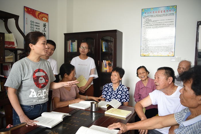 福建省莆田市荔城区依托村居文化活动中心建成“清风茶话室”,以方言形式向农村党员、干部、群众宣讲习近平新时代中国特色社会主义思想,进一步掀起“大学习”热潮。图为近日,该区西天尾镇纪委书记许瑾在龙山村“清风茶话室”与村里的党员、群众共同学习讨论。(莆田市荔城区纪委监委)