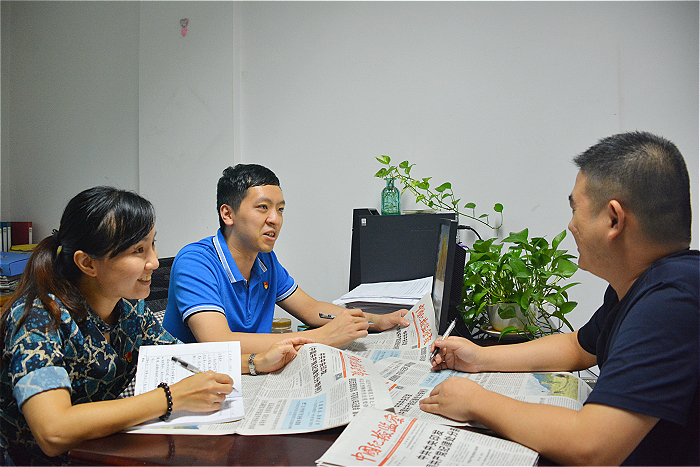 新修订的《中国共产党纪律处分条例》全文公布后,连日来,莆田市城厢区纪检监察干部通过网站、报刊、微信平台,掀起学习《条例》的热潮。图为8月29日,该区纪委监委干部在讨论交流《条例》的内容。