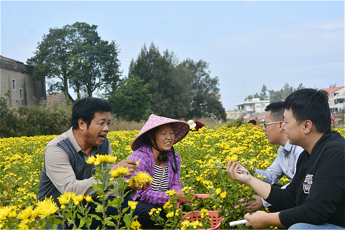 福建省莆田市城厢区东海镇因地制宜,采用“村集体投资+种植户管理”的农业种植产业带动脱贫模式,精准监督扶贫资金落实情况,激活贫困村的“造血”功能。图为日前,纪检监察干部在坪洋村向种植户了解金丝皇菊生产收入和扶贫资金发放情况。(宋雅炜 摄)