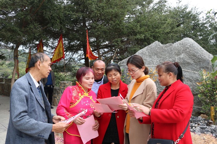 农历正月十五元宵节当天,为了让群众在古老的民俗活动中过一个文明、廉正、热闹的节日,荔城区新度镇纪委干部到青垞村向村民宣传移风易俗,革除陈规陋习,树立文明新风。(福建日报记者 林爱玲 翁国城 摄)
