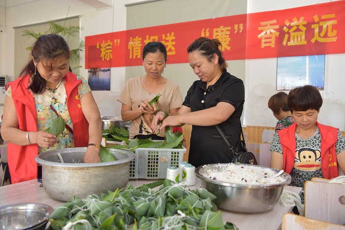 端午节前夕,莆田市荔城区在各镇街、村居开展“粽情相送廉香溢远”迎端午主题活动,组织党员干部与群众一起包粽子,共同体验民俗活动,倡导文明、节俭、清廉过节。图为6月5日,该区北高镇党员志愿者与群众共包“廉洁粽”。(莆田市荔城区纪委监委)
