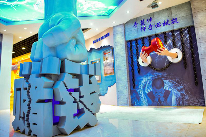 福建省莆田市荔城区廉政文化警示教育基地通过廉政教育和警示教育相结合的方式,将展厅命名为“廉心若水,正气如山”,展厅分为“立廉篇”“立警篇”“立心篇”“立行篇”四个篇章。图为立警篇的互动体验区,前方是一只拳头,重重压住钱、赌、权等多种贪欲,表示纪检监察机关重拳出击,对腐败贪污行为“零容忍”的态度;后方有声光电的互动效果,两个钱币比喻手铐,伸手触碰公章会发出警报,警示党员干部如果利用公权力谋取不当利益,最终必将受到严惩。(翁晓琳 摄)
