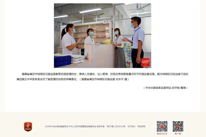 福建省莆田市荔城区纪委监委聚焦疫情防控,组织纪检监察干部组成5个疫情防控督导小组,到大型商场、学校等重要场所,对关键部门、重点人员的履职尽责情况开展实地监督检查。图为9月11日,该区第一督查小组在砺青中学查看防疫物资储备情况。吴震 摄