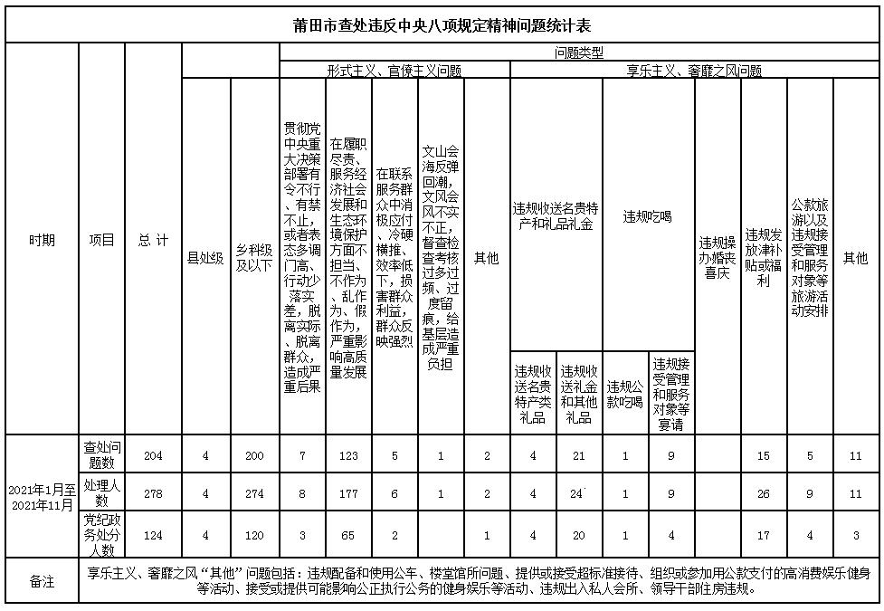 莆田市通报2021年1-11月查处违反中央八项规定精神问题情况